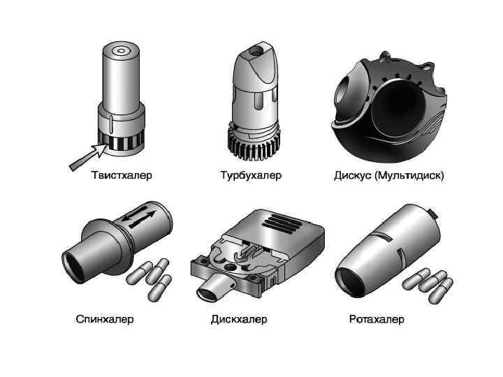 Классификация систем доставки препаратов в дыхательные пути I. Дозированные аэрозольные ингаляторы (ДАИ): • Со спейсером. • С лицевой маской. • Активируемые вдохом. II. Дозированные жидкостные ингаляторы (ДЖИ). III. Дозированные порошковые ингаляторы (ДПИ): • Капсульные (спинхалер, ротахалер, дискхалер). • Резервуарные (турбухалер, циклохалер, изихалер). • Мультидозирующие (мультидиск). IV. Небулайзеры (НБ) (в том числе активируемые вдохом): • Струйные или компрессорные. • Ультразвуковые.