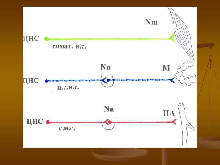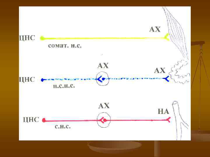 передача сигнала Симпатический отдел n n n 1 -й нейрон: спинной мозг и ганглии пограничного симпатического ствола 2 -й нейрон: вегетативные ганглии Переключение с 1 -го на 2 -й – ацетилхолин (н) Переключение на эффектор – норадреналин ( 1 или 1) Эффектор интрамуарльно Парасимпатический отдел n n n 1 -й нейрон: головной или спинной мозг 2 -й нейрон: интрамуральные ганглии Переключение с 1 -го на 2 -й – ацетилхолин (н) Переключение на эффектор – ацетилхолин (м) Эффектор: интрамурально
