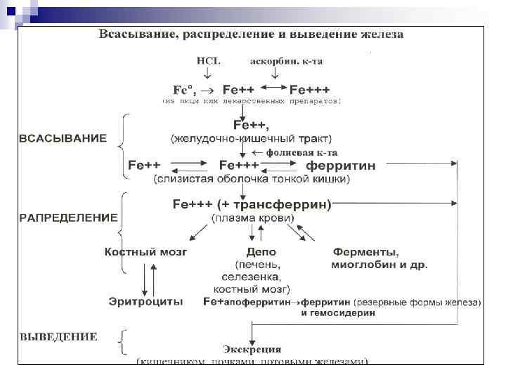 ПРИЧИНЫ ВОЗНИКНОВЕНИЯ ЖЕЛЕЗОДЕФИЦИТНЫХ (ГИПОХРОМНЫХ) АНЕМИЙ n НЕДОСТАТОЧНОЕ ПОСТУПЛЕНИЕ ЖЕЛЕЗА В ОРГАНИЗМ - НЕСБАЛАНСИРОВАННОЕ ПИТАНИЕ - НАРУШЕНИЕ ВСАСЫВАНИЯ ЭНТЕРИТЫ, МАССИВНАЯ РЕЗЕКЦИЯ ТОНКОГО К-КА, СИНДРОМ МАЛЬАБСОРБЦИИ АХИЛИЯ АВИТАМИНОЗ С ГИПОПРОТЕИНЕМИЯ n ПОТРЕБНОСТЬ ОРГАНИЗМА В ЖЕЛЕЗЕ ВЫШЕ НОРМЫ - БЕРЕМЕННОСТЬ - ЛАКТАЦИЯ - ПЕРИОД БУРНОГО РОСТА У ДЕТЕЙ n БОЛЬШИЕ ПОТЕРИ ЖЕЛЕЗА - ХРОНИЧЕСКАЯ КРОВОПОТЕРЯ - ПОВЫШЕННОЕ ПОТООТДЕЛЕНИЕ - ИНФЕКЦИОННЫЕ ЗАБОЛЕВАНИЯ