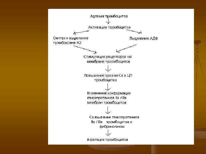 n n Агрегация тромбоцитов регулируется системой тромбоксан - простациклины, которые образуются из арахидоновой кислоты при участии ЦОГ и эндопероксидов. Механизм агрегации тромбоцитов Тромбоксан А 2 вызывает вазоконстрикцию и агрегацию тромбоцитов – происходит активация фосфолипазы С, увеличивается образование 1, 4, 5 – инозитолтрифосфатов, увеличивается содержание Са, Т 1/2=30 сек
