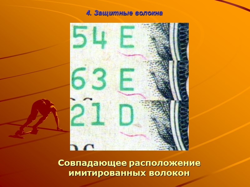 Цветовая гамма защитных волокон охватывает весь видимый диапазон спектра. Значительно повышают уровень защиты бумаги волокна, обработанные люминофорами, светящими при освещении их ультрафиолетовыми лучами. 4. Защитные волокна