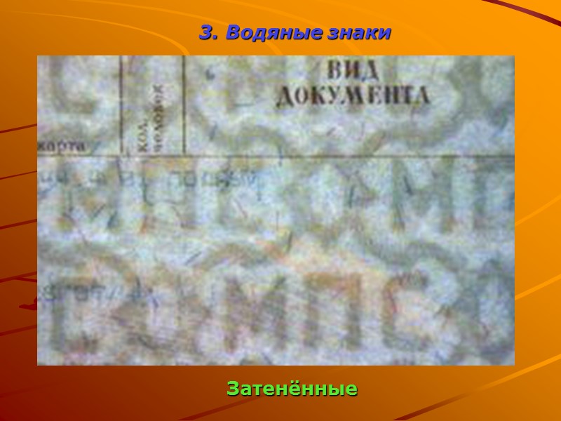 3. Водяные знаки Имитированный с помощью печатной формы (надпечатка на поверхности листа бумаги) Истинный На просвет