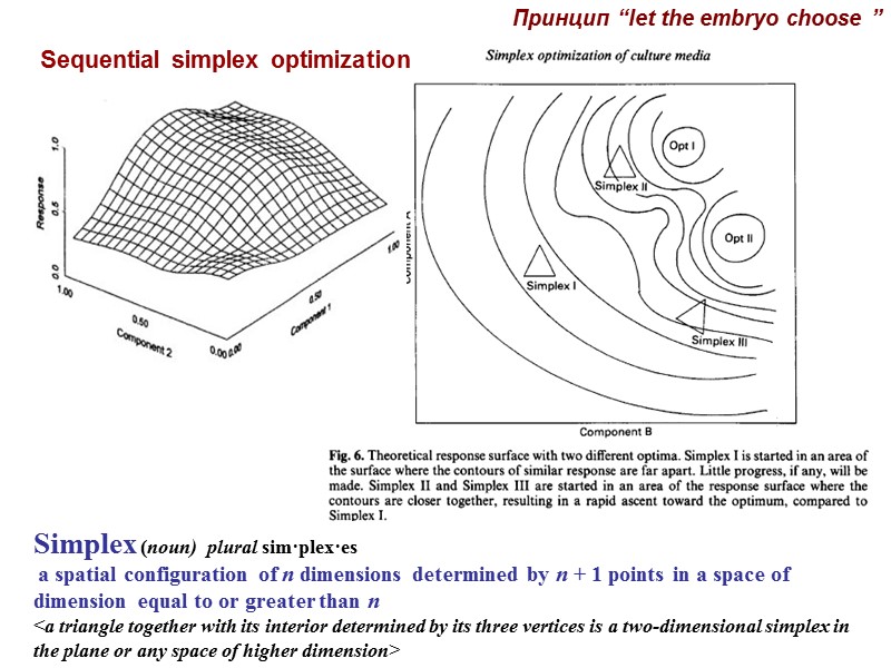 Принцип “let the embryo choose ” Блок развития при культивировании с зиготы: для решения проблемы были использованы математические программы и компьютерные модели Sequential simplex optimization SOM - simplex optimization method Среда KSOM Liwitts, Biggers: “…. Two computer programs are now commercially available to control the experimental program—COPS from Elsevier Scientific Software, New York, USA, and SIMPLEX-V® from Statistical Programs, Houston, Texas, USA. We have adapted the COPS program to optimize 10 components in a medium for the culture of mouse preimplantation embryos. Our method takes into consideration the biological variation associated with culture systems…. “