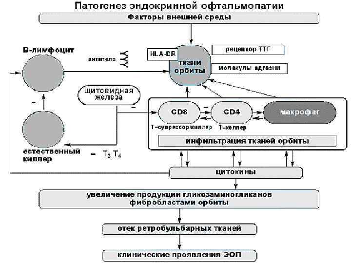 Патогенез болезни Грейвса БГ является мультифакториальным заболеванием, при котором генетические особенности иммунного реагирования реализуются на фоне действия факторов окружающей среды. Наряду с этнически ассоциированной генетической предрасположенностью (носительство гаплотипов HLAB 8, DR 3 и DQA 1*0501 у европейцев) в патогенезе БГ определенное значение придается психосоциальным и средовым факторам. Так, уже достаточно давно обсуждается значение инфекционных и стрессорных факторов, в частности, ряд работ выдвигает теорию "молекулярной мимикрии" между антигенами ЩЖ, ретробульбарной клетчатки и рядом стресспротеинов и антигенов бактерий (Yersinia enterocolitica). Эмоциональные стрессорные и экзогенные факторы, такие как курение, могут способствовать реализации генетической предрасположенности к БГ. Так, была обнаружена временная взаимосвязь между манифестацией БГ и потерей супруга (партнера). Курение повышает риск развития БГ в 1, 9 раз. БГ в ряде случаев сочетается с другими аутоиммунными эндокринными заболеваниями (сахарный диабет 1 типа, первичный гипокортицизм); такое сочетание принято обозначать, как аутоиммунный полигландулярный синдром II типа.