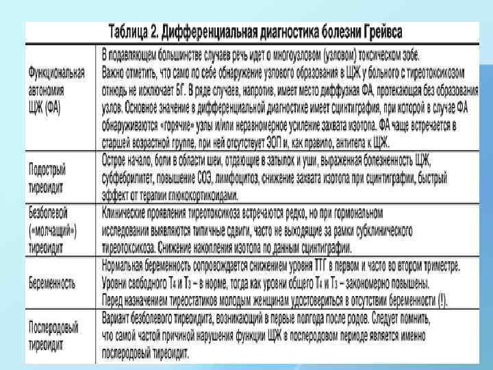 Диагностические критерии болезни Грейвса • Лабораторно подтвержденный тиреотоксикоз (ТТГ< 0, 4 м. Ед/л, Т 4 и/или Т 3 выше нормы) • Эндокринная офтальмопатия • Диффузное увеличение объема щитовидной железы • Повышенный уровень антител к рецептору ТТГ • Тонкоигольная пункционная аспирационная биопсия