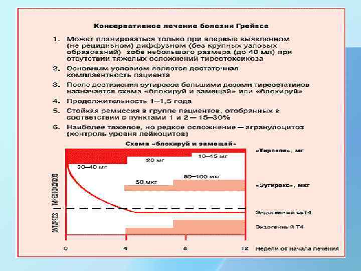 ТИРЕОСТАТИЧЕСКИЕ ПРЕПАРАТЫ • Тиамазол/Thiamazole 0, 005 (супрессивная доза 30 – 40 мг/сут в 2 – 3 приема, поддерживающая доза 5 – 10 мг однократно) • Пропилтиоурацил/Propylthiouracil 0, 05 (супрессивная доза 300 мг/сут в 3 – 4 приема, поддерживающая доза 50 мг). Возможно применение у беременных и кормящих в супрессивной дозе до 200 мг. • Супрессивные дозировки от 3 до 6 недель, затем постепенное снижение дозы под контролем f. T 4. • Поддерживающие дозировки – на 1 – 1, 5 года при болезни Грейвса.