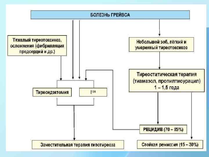 Лечение болезни Грейвса • Консервативная тиреостатическая терапия (тиамазол, пропилтиоурацил) • Хирургическое лечение (субтотальная резекция щитовидной железы или тиреоидэктомия) • Терапия радиоактивным йодом 131 I