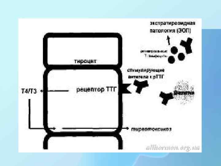 Этиология болезни Грейвса • Генетическая предрасположенность (носительство гаплотипов HLA B 8, DR 3) • Психосоциальные факторы • Экзогенные факторы (курение) • Нарушения иммунного ответа (аутоагрессивные лимфоциты инфильтрируют паренхиму щитовидной железы) • Образование стимулирующих антител к мембранному фрагменту рецептора ТТГ в тироцитах • Гипертиреоз + гипертрофия тироцитов