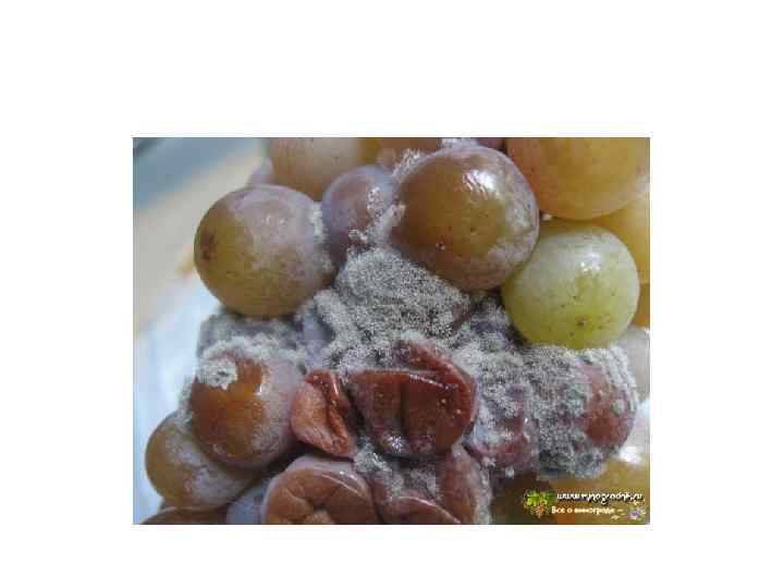 • • • Болезни винограда Серая гниль это единственный паразит виноградного куста, сопровождающий его на протяжении всего года там, где возникают благоприятные условия для заражения и развития. Поражаются все зеленые части куста и однолетняя древесина. Гриб опасен при проведении прививок, потому что наряду с заготовленными черенками он поражает также и места прививки. Он селится на начинающих рост побегах и может вызвать сильное выпадение уже при стратификации, а позже также и в питомнике. Признаки заболевания. На виноградниках серая гниль в холодную и сырую весеннюю погоду покрывает налетом распускающиеся глазки и молодые побеги. В плохо вентилируемых насаждениях, при влажной погоде образуется серый налет, покрывающий все части грозди винограда, который пылит прикосновении. Часто вся гроздь превращается в непривлекательный, кашеобразный комок. В сухую погоду развитие гриба ограничивается первыми, пораженными им ягодами, которые потом сморщиваются. Одностороннее удобрение азотом повышает восприимчивость кустов к болезни. При наступлении сухой погоды весенняя инфекция почти всегда прекращается. Пораженные соцветия винограда или их части отмирают, буреют и усыхают в сухую погоду, напоминая признаки паралича гребней. В виноградарстве серая гниль особенно опасна как возбудитель гнили ягод и гребней. При раннем заражении гроздей важно то, что этот гриб поражает прежде всего места ранений или ослабленные части куста винограда. Методы борьбы. В принципе не отличаются от методов борьбы с милдью и оидиумом. Своевременная обработка растений фунгицидами предотвращает развитие болезней.