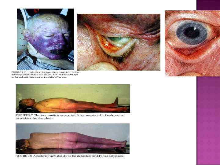 1. синюшность лица 2. расширение зрачков 3. субконъюктивалные экхимозы 4. быстрое появление и обилие трупных пятен 5. непроизвольное мочеиспускание, семяизвержение и дефекация. 1. 2. 3. 4. 5. 6. Венозное полнокровие внутренних органов и головного мозга Частичная эмфизема легких Жидкая, темная кровь Кровоизлияния под висцеральной плеврой и эпикардом. Асфиксическое сердце Малокровная, сокращенная селезенка