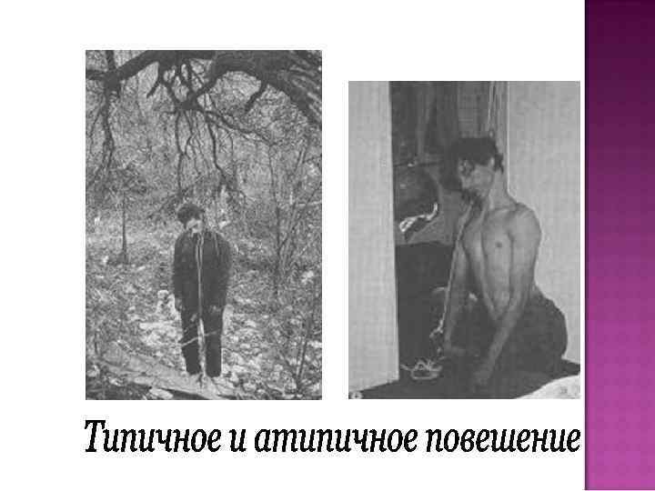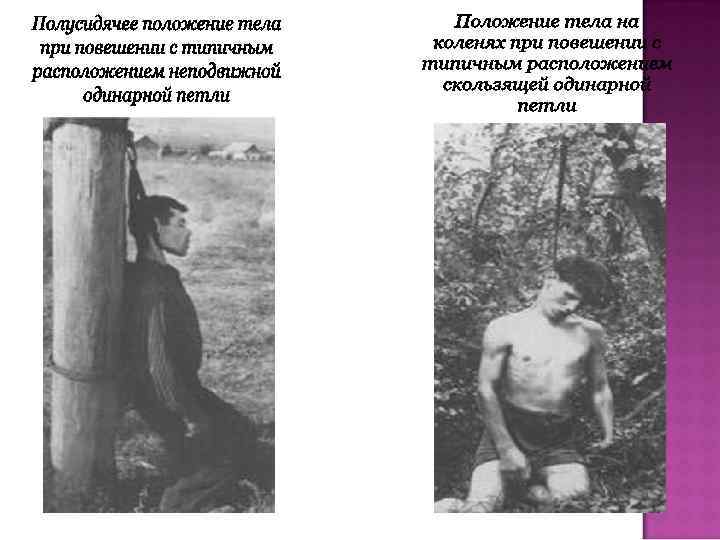 Повешение - это сдавление с помощью петли органов шеи под собственным весом. Повешение может быть в состоянии полного и не полного повешения. Петля является орудием повешения. Существует несколько видов петель: одиночные, двойные и множественные, скользящие и неподвижные, закрытые и открытые