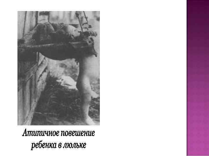 Повешение. Судебно – медицинская диагностика 1. Повешение всегда сопровождается образованием странгуляционной бороздыместо от давления петли, один из видовых признаков повешения. 2. Появляются поперечные надрывы интимы сонных артерий ( признак Амюссе). 3. В области грудных частей mm. sternocleidomastoidei появляются кровоизлияния ( признаки Вельхера) 4. Кровоизлияния в мышцы груди ( признаки Рейтера)
