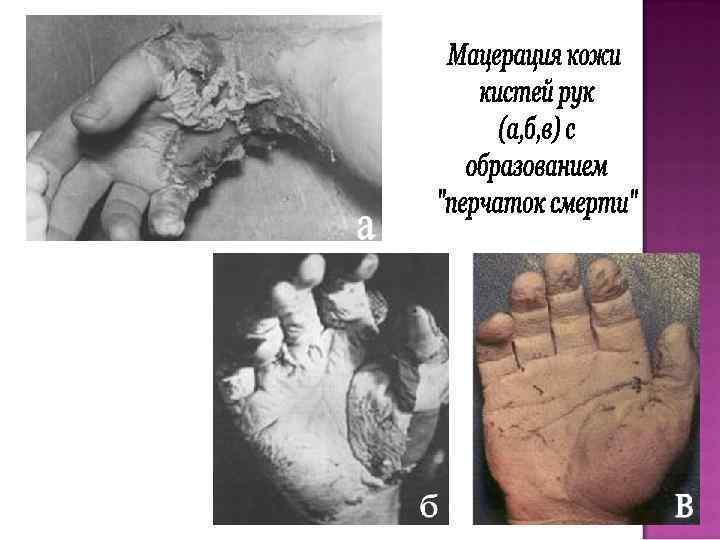 ПРИЗНАКИ ПРЕБЫВАНИЯ ТРУПА В ВОДЕ I. Мацерация- 1 степень –» рука прачки» - Отслоение рогового слоя до ногтевых пластинок-2 степень - Отслоение вместе с ногтевыми пластинами – 3 степень II. Посмертное облысение – выпадение волос III. Повреждение от фауны водоема IV Обрастание водорослям