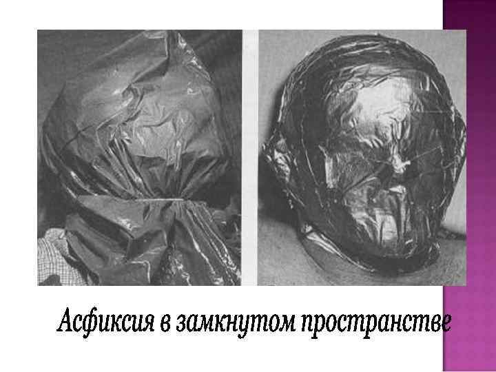 Механическая асфиксия От сдавления (strangulatio) В ограниченом пространстве От закрытия (suffocatio) Повешение Закрытие носа и рта Удавление петлёй Закрытие дыхательных путей посторонними предметами Удавление руками Сдавление груди и живота Утопление (submersio)
