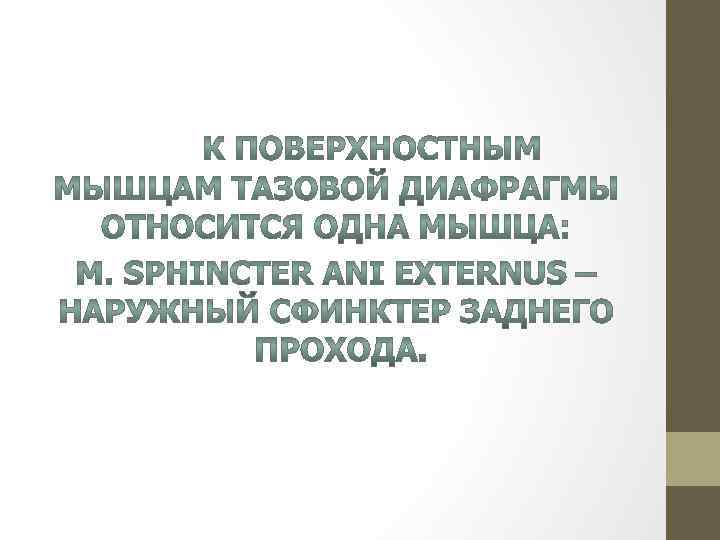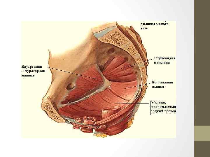 m. levator ani, мышца, поднимающая задний проход. Берет начало на стенке таза спереди от нисходящей ветви седалищной кости, латеральнее лобкового симфиза, затем от фасции m. obturatorius internus, и сзади от тазовой поверхности седалищной кости частью волокон направляется назад и к середине, обхватывают прямую кишку, срастаясь с ее мышечной оболочкой. Другая часть проходит, миновав прямую кишку, с латеральной стороны предстательной железы, мочевого пузыря, а у женщин влагалища, тесно прилегая к ним и переплетаясь с мускулатурой vesica urinaria et vagina. Заканчивается у копчика посредством lig. anococcygeum. функция – поднимает anus, укрепляет тазовое дно, а у женщин также сдавливает влагалище. m. coccygeus, копчиковая мышца. Начинается от spina ischiadica и от тазовой поверхности lig. sacrospinale, прикрепляется к боковому краю копчика и верхушке крестца.