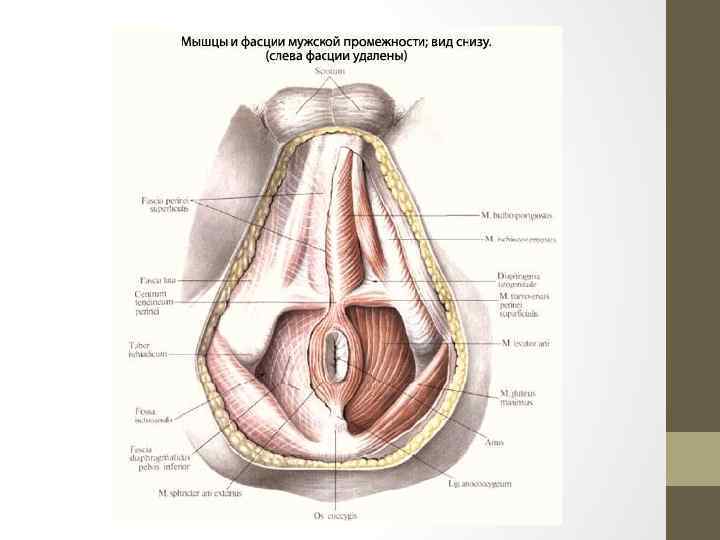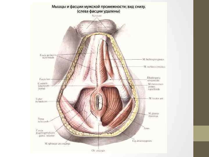 Мышцы промежности 1 — луковично-губчатая мышца; 2 — поверхностная фасция промежности; 3 — седалищно-пещеристая мышца; 4 — поверхностная поперечная мышца промежности; 5 — наружный сжиматель заднего прохода; 6 — мышца, поднимающая задний проход; 7 — большая ягодичная мышца