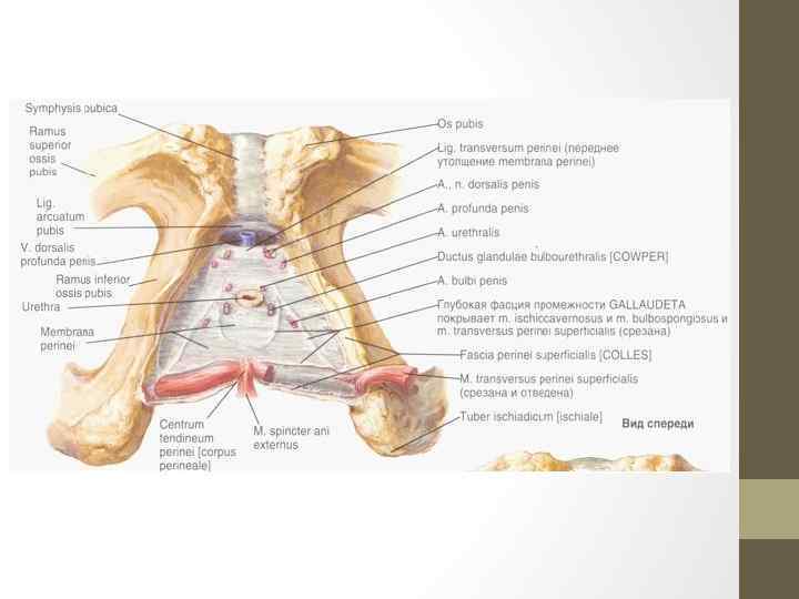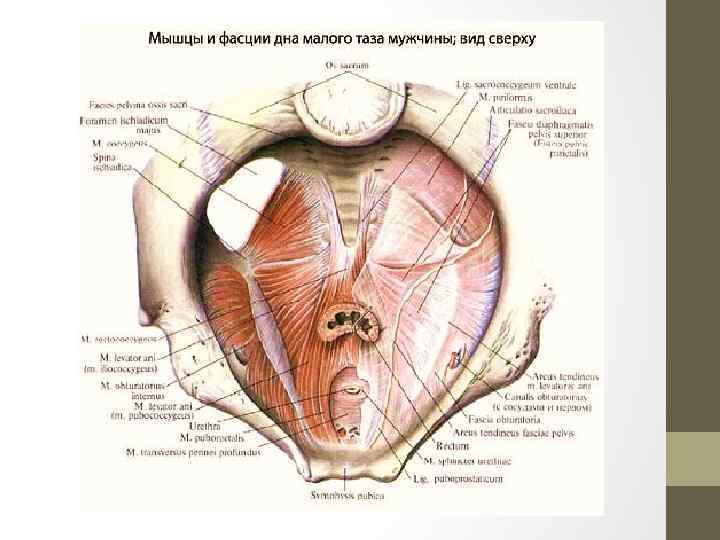 1 — глубокая поперечная мышца промежности; 2 — уретра; 3 — мышца, поднимающая задний проход; 4 — сухожильная дуга мышцы, поднимающей задний проход; 5 — внутренняя запирательная мышца; 6 — мышца, поднимающая задний проход; 7 — прямокишечнокопчиковая мышца; 8 — седалищная ость; Мышцы и фасции дна малого таза у мужчин (вид сверху): 9 — копчиковая мышца; 10 — большое запирательное отверстие; 11 — тазовая поверхность костей крестца; 12 — крестец; 13 — вентральная крестцово-копчиковая связка; 14 — грушевидная мышца; 15 — крестцово-подвздошное сочленение; 16 — верхняя фасция диафрагмы таза; 17 — запирательный канал с сосудами и нервами; 18 — прямая кишка; 19 — мышца поднимающая перепончатую часть мочеиспускательного канала; 20 — лобковопредстательная связка; 21 — лобковый симфиз.