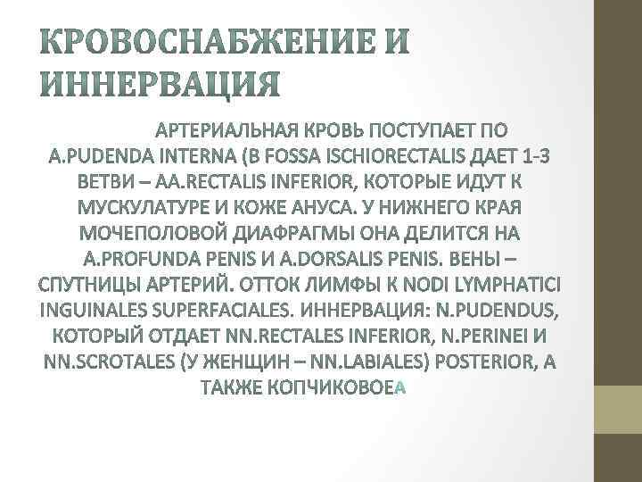 Промежность, perineum, - пространство, соответствующее выходу таза и выполненное произвольными мышцами, которые покрыты фасциями и составляют вместе с ними две диафрагмы: мочеполовую, diaphragma urogenitale, и тазовую, diaphragma pelvis. Обе диафрагмы пропускают наружу каналы мочеполовой и пищеварительной систем, для которых образуют жомы, закрывающие наружные отверстия этих каналов. Промежность можно сравнить с фигурой ромба: спереди – symphysis pubica, сзади – верхушка копчика, справа и слева – седалищные бугры. Ромб состоит из двух треугольников: переднего – заполненного мочеполовой диафрагмой, и заднего, заполненного тазовой диафрагмой. Через мочеполовую диафрагму у мужчин проходит urethra, а у женщин, кроме того, еще и влагалище. Через тазовую диафрагму у обоих полов выходит прямая кишка. Промежуток между задним проходом и наружными половыми органами называется промежностью в узком смысле слова.