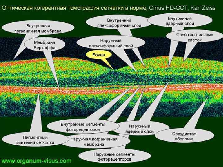 ОКТ позволяет определить и оценить: • морфологические изменения сетчатки и слоя нервных волокон, толщину этих структур; • различные параметры диска зрительного нерва; • анатомические структуры переднего отрезка глаза и их пространственное взаимоотношение.