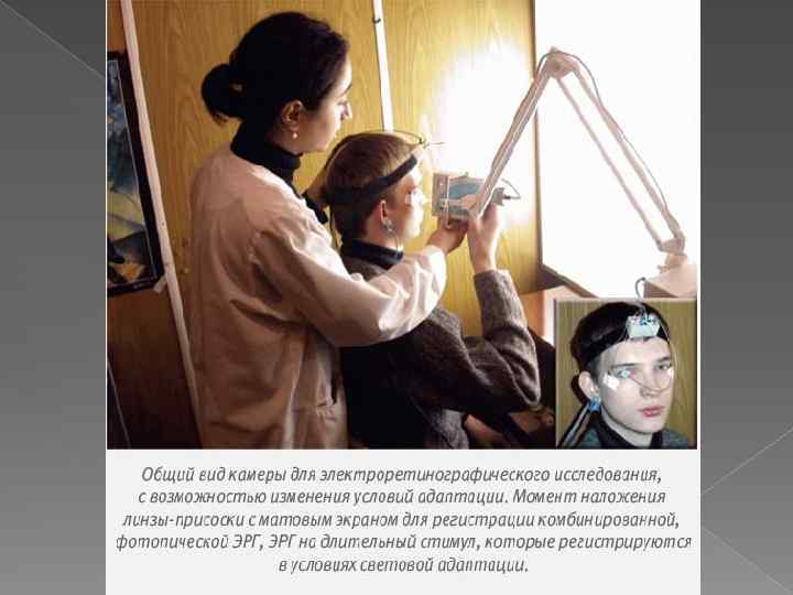 Электроретинография - метод регистрации изменений Методика заключается в размещении на поверхности глаза специального электрода, который взаимодействует с другим электродом, расположенным на коже затылка. В случае наличия у пациента заболевания сетчатки электрический потенциал меняется. биопотенциала сетчатки глаза, который образуется в результате воздействия света на глаз.