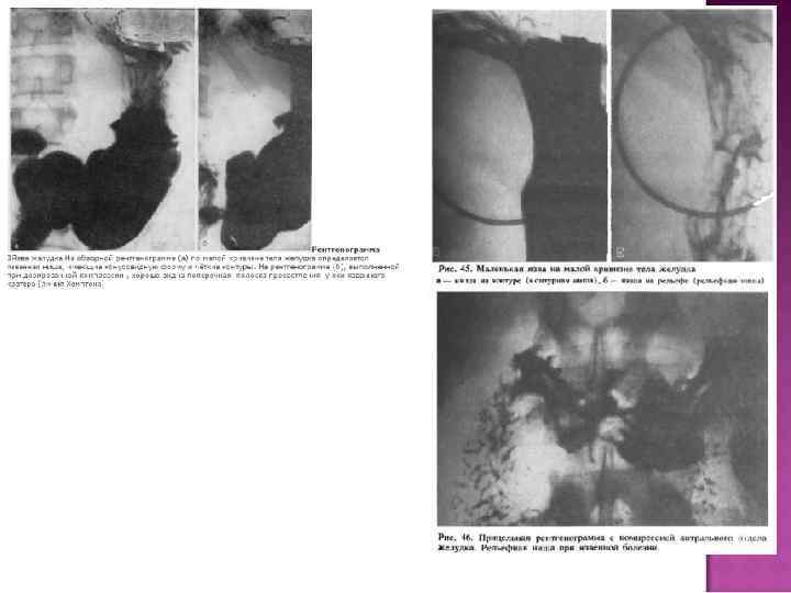 Обязательные инструментальные исследования 1. ФЭГДС. При локализации язвы в желудке - взятие 4 -6 биоптатов из дна и краѐв язвы с их гистологическим исследованием с целью исключения рака ; 2. УЗИ печени, поджелудочной железы, желчного пузыря. 3. Определение инфицированности Helicobacter pylori эндоскопическим уреазным тестом, морфологическим методом, иммуноферментным или дыхательным тестом; Дополнительные лабораторные исследования: определение уровня сывороточного гастрина. Дополнительные инструментальные исследования (по показаниям) 1. внутрижелудочная р. Н-метрия; 2. эндоскопическая ультрасонография; 3. рентгенологическое исследование желудка; 4. компьютерная томография. Эндоскопическая картина стадий язвенного поражения: Фаза обострения: І стадия - острая язва. На фоне выраженных воспалительных изменений СОЖ и ДПК - дефект (дефекты) округлой формы, окруженные воспалительным валом; выраженный отек. Дно язвы с наслоением фибрина. II стадия - начало эпителизации. Уменьшается гиперемия, сглаживается воспалительный вал, края дефекта становятся неровными, дно язвы начинает очищаться от фибрина, намечается конвергенция складок к язве. Фаза неполной ремиссии: III стадия - заживление язвы. На месте репарации - остатки грануляций, рубцы красного цвета разнообразной формы, с деформацией или без нее. Сохраняются признаки активности гастродуоденита. Ремиссия: Полная эпителизация язвенного дефекта (или "спокойный" рубец), отсутствуют признаки сопутствующего гастродуоденита. Контрастное рентгенологическое исследование верхних отделов ЖКТ также позволяет выявить язвенный дефект, однако по чувствительности и специфичности рентгенологический метод уступает эндоскопическому. Внутрижелудочная р. Н-метрия. При язвенной болезни наиболее часто обнаруживают повышенную либо сохранѐнную кислотообразующую функцию желудка.