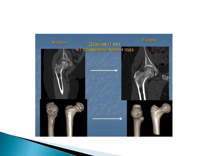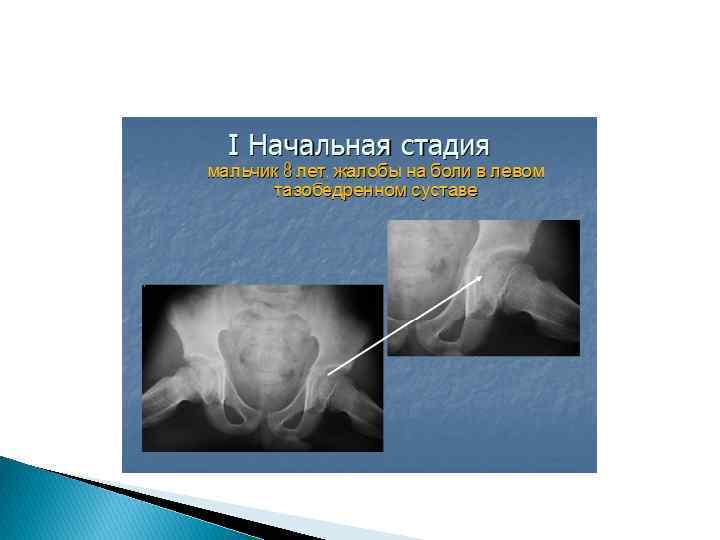 Остеохондропатия головки бедренной кости – болезнь Легг - Кальве - Пертеса I фаза • усиление интенсивности головки бедренной кости, уменьшение величины головки и ее уплощение, увеличение высоты рентгеновской суставной щели, вызывающее подвывих бедра кнаружи (В. С. Майкова-Строганова, Д. Г. Рохлин считают этот признак одним из ранних). Эти начальные признаки могут улавливаться лишь через несколько месяцев от начала заболевания. II фазе • эпифиз подвергается большей компрессии, состоит из нескольких плотных фрагментов, разделен бесструктурными участками, обусловленными рассасыванием некротической ткани и врастанием хрящевой ткани. Эта фаза может длиться до 2 -3 лет. Процесс может захватывать всю головку и даже шейку бедра, величина фрагментированного участка зависит от своевременного начала лечения (иммобилизация на 1 -2 мес и затем дозированная нагрузка на конечность). III фаза • отмечается типичная деформация головки и шейки бедра. Головка принимает грибовидную форму. Шейка укорачивается, шеечнодиафизарный угол уменьшается. Вертлужная впадина уплощается. Расширена рентгеновская суставная щель, сохраняется подвывих бедра кнаружи.