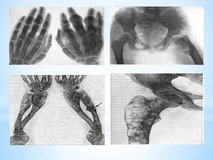 *Рентгенологическая картина Трубчатые кости умеренно или значительно укорочены, эпиметафизы булавовидно расширены, вздуты; в метафизах определяются очаги просветления неоднородной структуры за счет костных перегородок, расположенных чаще всего веерообразно. Подобные изменения встречаются в костях таза, лопатках, ребрах. Возможно озлокачествление одного из хондроматозных узлов.