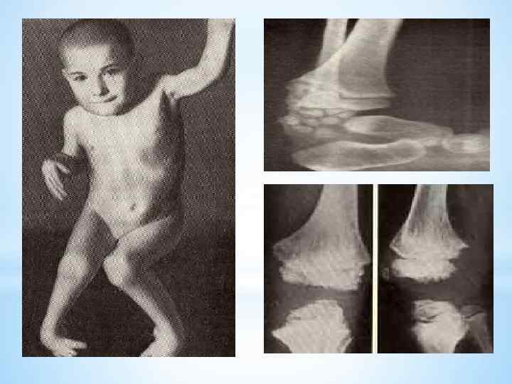 *Заболевание возникает у детей исподволь, медленно, бессимптомно. Наблюдается по сравнению с ростом сверстников, низкорослость без нарушения пропорции тела. *Затем появляются деформации конечностей, преимущественно нижних, тугоподвижность в суставах, боль. Обязательно выявляются изменения со стороны позвоночника. *Лечение деформаций оперативное. Применяется аппарат Илизарова с кортикотомией и поперечной остеотомией костей нижних конечностей.