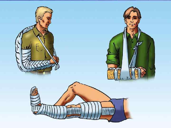При иммобилизации соблюдают следующие правила: шина должна фиксировать не менее двух суставов, а при переломе бедра – все суставы нижней конечности, следствием ошибки является обычно смещение отломков во время транспортировки пациента. шину накладывают поверх одежды и обуви, которые при необходимости разрезают; перед наложением шины ее необходимо подогнать под размер поврежденной конечности. для предупрежд ен сдавливания тк ия ане в местах костны й х выступов накладывают м ягкий материал; шину нельзя накладывать с т ой стороны, где выступает сломанная кост ь. Концы пальцев , если они не повреждены, оставляют открытыми для контроля за кровообращени ем.