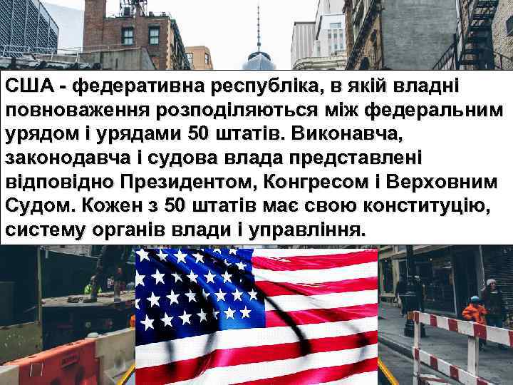 США - федеративна республіка, в якій владні повноваження розподіляються між федеральним урядом і урядами 50 штатів. Виконавча, законодавча і судова влада представлені відповідно Президентом, Конгресом і Верховним Судом. Кожен з 50 штатів має свою конституцію, систему органів влади і управління.