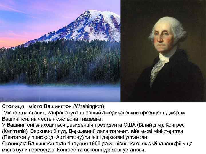 Географічне положення Країна розташована в Північній Америці. Адміністративний поділ - 50 штатів (state) і 1 федеральний округ. Штати поділяються на округи (county and parish) Територія - 9 373 тис. кв. км. Населення - 281 421 906 осіб (на 1 квітня 2000 р. ). Столиця - місто Вашингтон (Washington) Місце для столиці запропонував перший американський президент Джордж Вашингтон, на честь якого вона і названа. У Вашингтоні знаходиться резиденція президента США (Білий дім), Конгрес (Капітолій), Верховний суд, Державний департамент, військові міністерства (Пентагон у пригороді Арлінгтону) та інші державні установи. Столицею Вашингтон став 1 грудня 1800 року, після того, як з Філадельфії у це місто були переведені Конгрес та основні урядові установи.