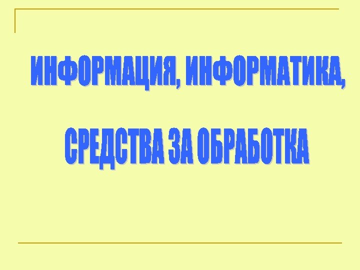 ПРЕДМЕТ НА ИНФОРМАТИКАТА: q ВЪЗНИКВАНЕ НА ИНФОРМАЦИЯТА; q ТЕОРЕТИЧНИ ОСНОВИ НА ИНФОРМАЦИЯТА; q ПРЕДСТАВЯНЕ И ИЗМЕРВАНЕ НА ИНФОРМАЦИЯТА; q СЪХРАНЯВАНЕ И ПРЕНАСЯНЕ НА ИНФОРМАЦИЯТА; q КОДИРАНЕ И ПРЕОБРАЗУВАНЕ НА ИНФОРМАЦИЯТА; q ЗАЩИТА И КРИПТИРАНЕ НА ИНФОРМАЦИЯТА; q СРЕДСТВА ЗА ОБРАБОТКА НА ИНФОРМАЦИЯТА; q ИЗПОЛЗВАНЕ НА ИНФОРМАЦИЯТА И ДРУГИ;