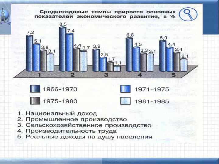 Экономическая реформа 1965 г. – «Косыгинская реформа» Наследие Хрущева: Ликвидировано деление органов по отраслевому принципу Отменены совнархозы и восстановлены министерства Изменена система планирования при расширении прав предприятий Отменены многие хрущевские «нововведения» Стимулирование труда Введение экономических методов хозяйствования Хозрасчёт Учитывалась местная инициатива 1966 -1970 гг. – Восьмая пятилетка – наилучшие показатели развития страны в Советский период