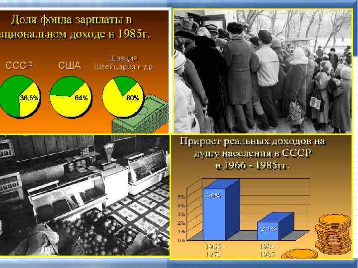 Социальная политика Сокращение жилищного строительства Уменьшение расходов на здравоохранение- ухудшение показателей продолжительности жизни и детской смертности Обострение продовольственной проблемы (рост импортных поставок продовольствия) 70 -е годы начало введения карточной системы Упал прирост реальных доходов