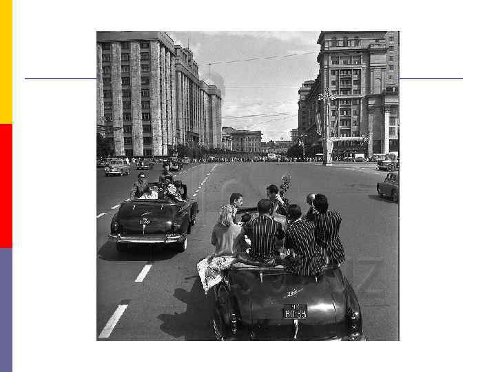 Город и деревня p p Разработка генпланов восстановления Ленинграда, Киева, Минска, Сталинграда; исторических городов С 1947 г. – «сталинская архитектура» В 1951 г. достигнут уровень потребления продуктов питания 1940 г. Знаки послевоенного благосостояния: авт. «Москвич» , «Победа» , радиоприемники, фотораппараты. p p p Восстановление деревни происходило за счет ее внутренних резервов. Всего 7% от общего объема ассигнований направлялось в деревню. 1946 г. – засуха, голод 1950 г. – укрупнение деревень 1951 г. – проект агрогородов «Бегство из деревни» -формирование слоя горожан в первом поколении, «старение» деревни