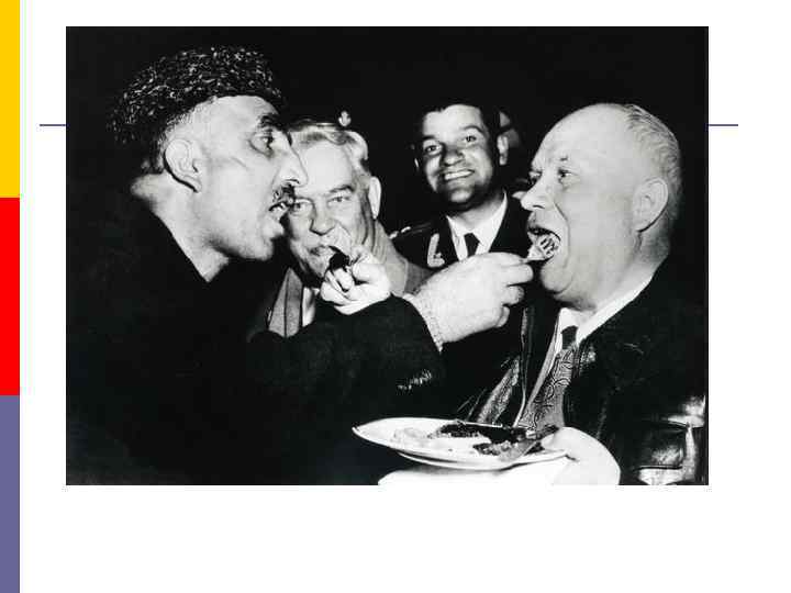 СССР в мировой политике: от «холодной войны» к «оттепели» p p p p p 1950 г. – установление отношений с КНР 1950 -1953 г. – Корейская война Март 1953 г. – глава МИД СССР В. М. Молотов 1955 г. – сближение с Югославией 1955 г. – встреча Хрущева с лидерами крупнейших держав в Женеве 1956 г. – тезис о мирном сосуществовании двух систем 1956 г. – визит Хрущева в Великобританию 1955 г. – визит канцлера ФРГ К. Аденауэра в СССР 1959 г. – визит Хрущева в США