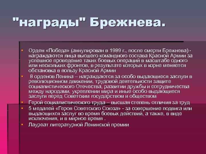 "награды" Брежнева. § Орден «Победа» (аннулирован в 1989 г. , после смерти Брежнева) - награждаются лица высшего командного состава Красной Армии за успешное проведение таких боевых операций в масштабе одного или нескольких фронтов, в результате которых в корне меняется обстановка в пользу Красной Армии § 8 орденов Ленина – награждаются за особо выдающиеся заслуги в революционном движении, трудовой деятельности защите социалистического Отечества, развитии дружбы и сотрудничества между народами, укреплении мира и иные особо выдающиеся заслуги перед Советским государством и обществом § Герой социалистического труда – высшая степень отличия за труд § 5 медалей «Героя Советского Союза» - за совершение подвига или выдающихся заслуг во время боевых действий, а также, в виде исключения, и в мирное время. § Лауреат литературной Ленинской премии