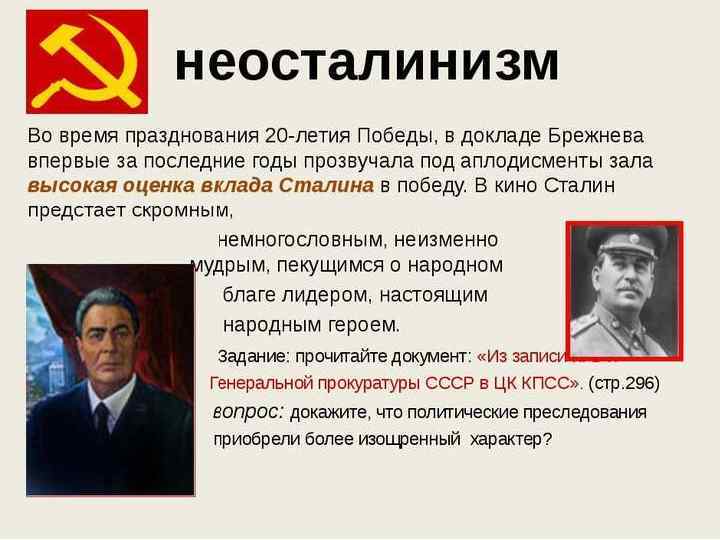Борьба внутри нового руководства В верхушке партии развернулась борьбы между реформаторами и консерваторами за влияние на Брежнева. А. Н. Шелепин, В. Е. Семичастный, Н. Г. Егорычев – сформулировали программу возвращения к сталинской политике, включая применение репрессий.