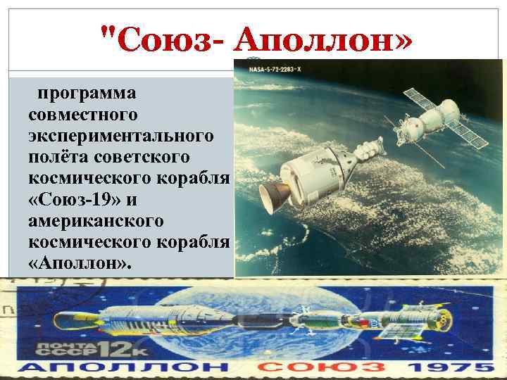 "Союз- Аполлон» программа совместного экспериментального полёта советского космического корабля «Союз-19» и американского космического корабля «Аполлон» .