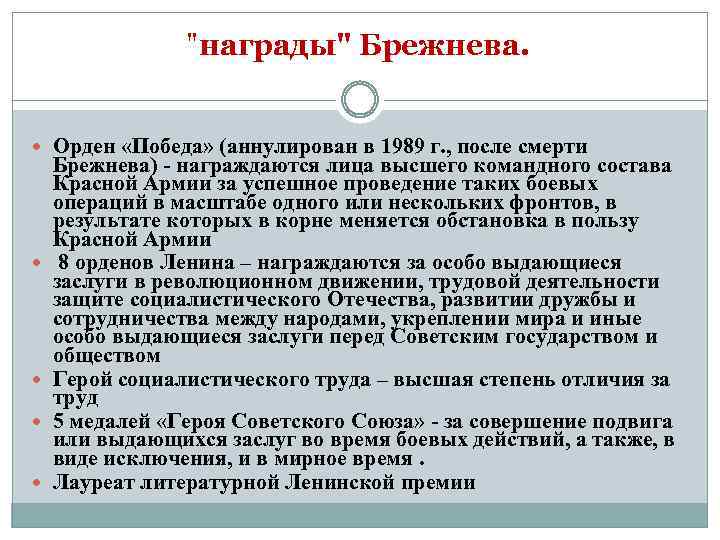 "награды" Брежнева. Орден «Победа» (аннулирован в 1989 г. , после смерти Брежнева) - награждаются лица высшего командного состава Красной Армии за успешное проведение таких боевых операций в масштабе одного или нескольких фронтов, в результате которых в корне меняется обстановка в пользу Красной Армии 8 орденов Ленина – награждаются за особо выдающиеся заслуги в революционном движении, трудовой деятельности защите социалистического Отечества, развитии дружбы и сотрудничества между народами, укреплении мира и иные особо выдающиеся заслуги перед Советским государством и обществом Герой социалистического труда – высшая степень отличия за труд 5 медалей «Героя Советского Союза» - за совершение подвига или выдающихся заслуг во время боевых действий, а также, в виде исключения, и в мирное время. Лауреат литературной Ленинской премии