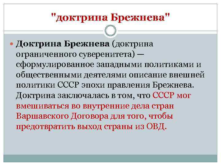 "доктрина Брежнева" Доктрина Брежнева (доктрина ограниченного суверенитета) — сформулированное западными политиками и общественными деятелями описание внешней политики СССР эпохи правления Брежнева. Доктрина заключалась в том, что СССР мог вмешиваться во внутренние дела стран Варшавского Договора для того, чтобы предотвратить выход страны из ОВД.