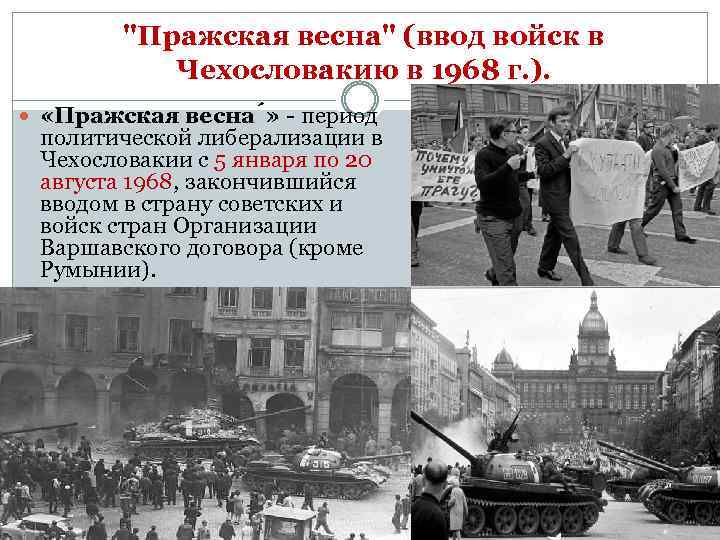 "Пражская весна" (ввод войск в Чехословакию в 1968 г. ). «Пражская весна » - период политической либерализации в Чехословакии с 5 января по 20 августа 1968, закончившийся вводом в страну советских и войск стран Организации Варшавского договора (кроме Румынии).