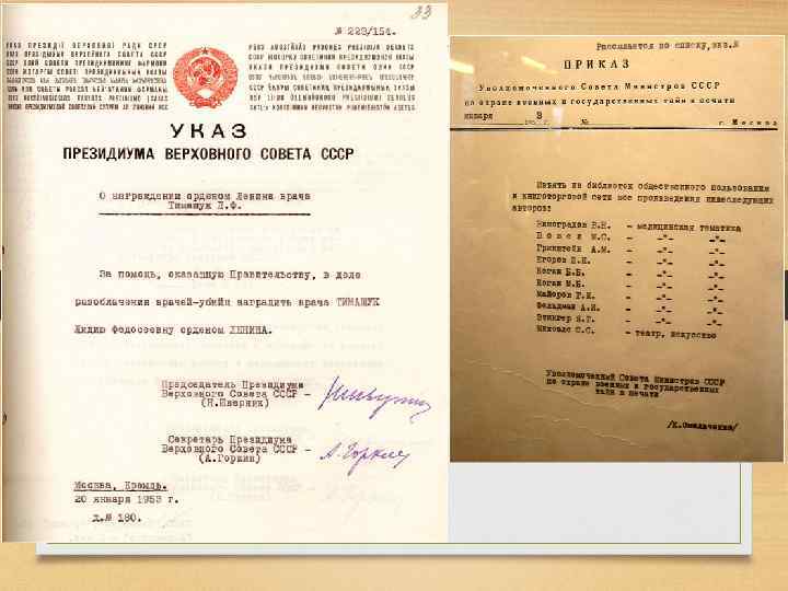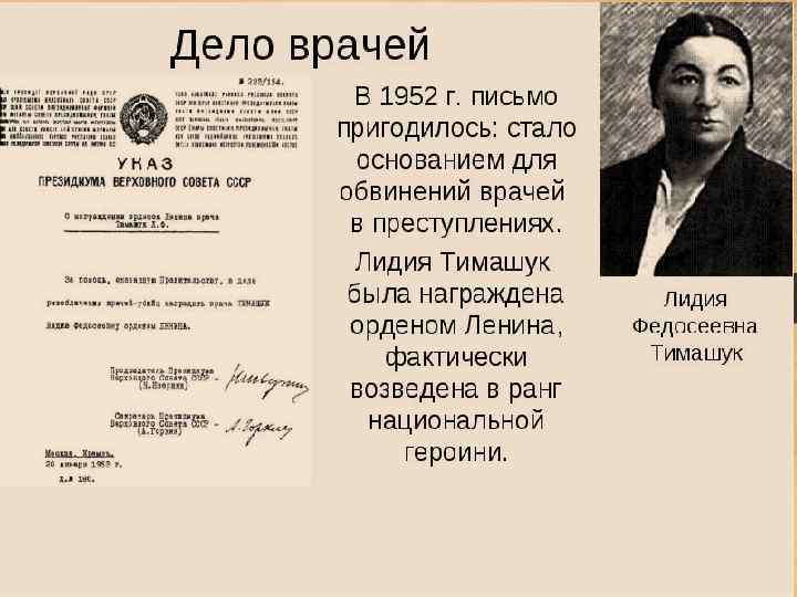 Политические процессы • 1952 -53 гг «дело врачей» (дело врачей-отравителей) • Дело, начатое органами госбезопасности В 1952 – начале 1953 года против группы московских медиков, преимущественно причастных к лечению высших должностных лиц СССР, по обвинению в покушениях на убийство Сталина, Жданова, Димитрова и других. • Дело носило антисемитский характер и было частью кампании по «борьбе С космополитизмом» , проводившейся В СССР В 1947– 1953 гг.