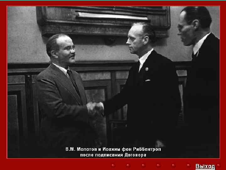 Пакт «Риббентропа - Молотова» 23 августа 1939 года- Пакт о ненападении сроком на 10 лет между Германией и СССР. Подписали: Министр иностранных дел Германии Иоахим фон Риббентроп Министр иностранных дел СССР В. М. Молотов