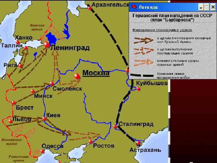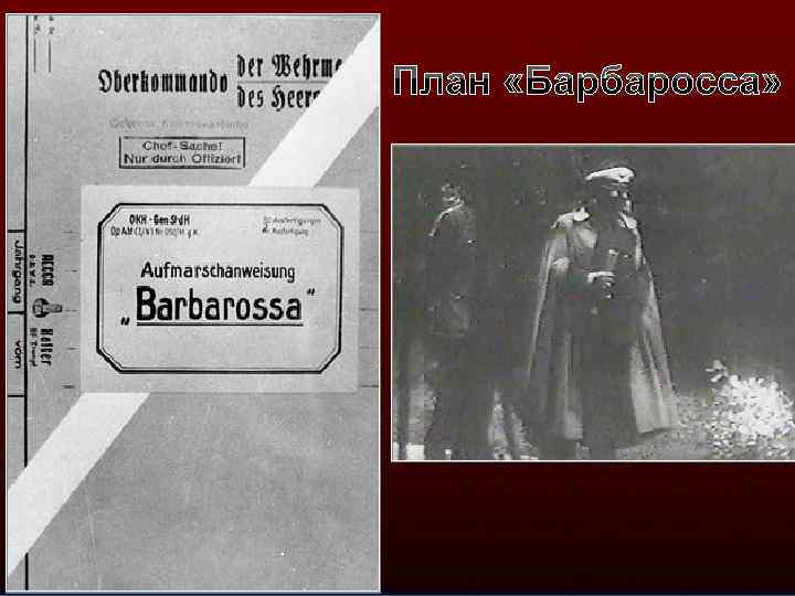 «План Барбаросса» Директива Гитлера № 21 о подготовке нападения на СССР Ставка фюрера, 18 декабря 1940 г. «…Германские вооруженные силы должны быть готовы разбить Советскую Россию в ходе кратковременной кампании …» В основу плана была положена идея молниеносной военной операции. Сроки выполнения: май-сентябрь 1941 г.