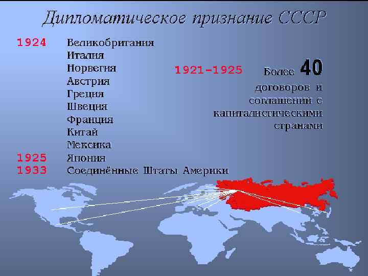 СТАНОВЛЕНИЕ МЕЖДУНАРОДНЫХ ОТНОШЕНИЙ 1920 – 1930 -х гг. * Международные отношения в 1920 -1930 -х гг. во многом определялись договорами и соглашениями, заключенными в Версале и Вашингтоне после окончания первой мировой войны. Державы-победительницы сумели навязать свою волю странам Четверного (Тройственного) союза и, как казалось тогдашним британским, французским и американским политикам, надежно обеспечили свои интересы. * Советская Россия (РСФСР, с 1922 г. - СССР) долгое время, до 1924 г. , официально не признавалась ведущими европейскими державами. С подписанием в конце 1920 – начале 1921 г. мирных договоров Финляндией, Эстонией, Латвией, Литвой, Польшей Советское государство вышло из международной изоляции. *Крупные индустриальные державы воздерживались от установления дипломатических отношений с Советской Россией.