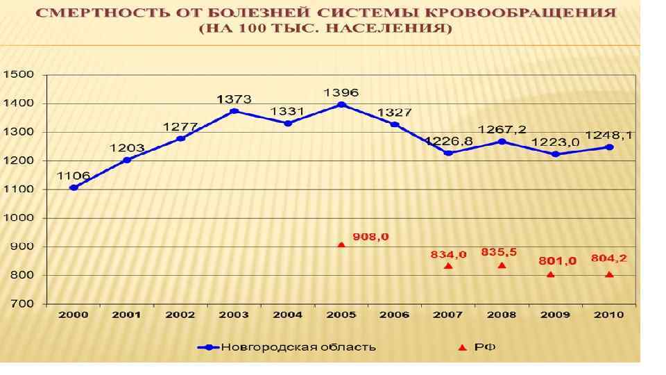 Динамика показателей смертности от ССЗ в России на 100 000 населения М 1200 800 Ж 600 1994 1995 2000 2005