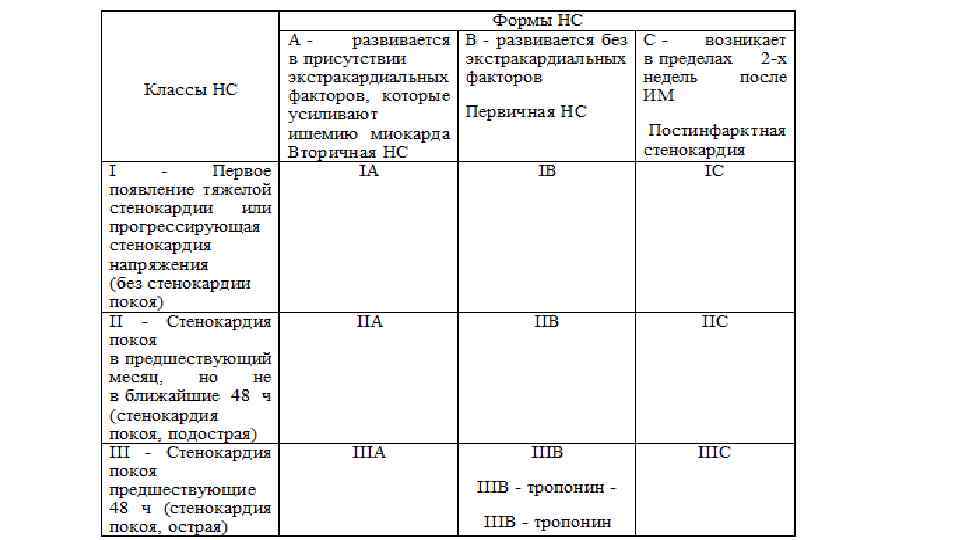 При подозрении на ОКС без подъема ST больные могут быть отнесены к следующим клиническим группам: • A. Больные после затяжного (>15 мин) приступа ангинозной боли в покое. Такое состояние обычно является основанием для вызова бригады скорой помощи или экстренного обращения в лечебное учреждение по другому пути. Оно соответствует III классу НС по классификации С. W. Hamm и Е. Braunwald (табл. ниже). • Б. Больные с впервые возникшей (в предшествующие 28 -30 дней) тяжелой стенокардией. • B. Больные, у которых произошла дестабилизация ранее существовавшей стабильной стенокардии с появлением характеристик, присущих, по крайней мере, III классу стенокардии по классификации Канадского сердечно-сосудистого общества, и/или приступов боли в покое (прогрессирующая стенокардия, стенокардия крещендо).