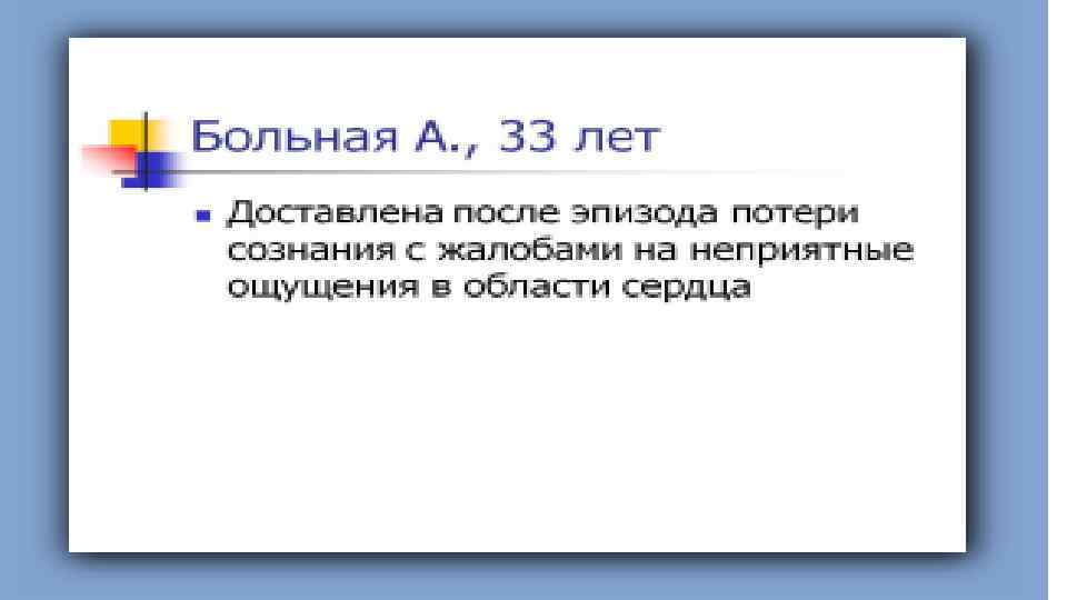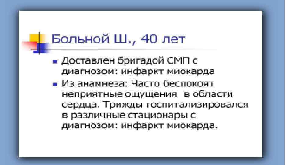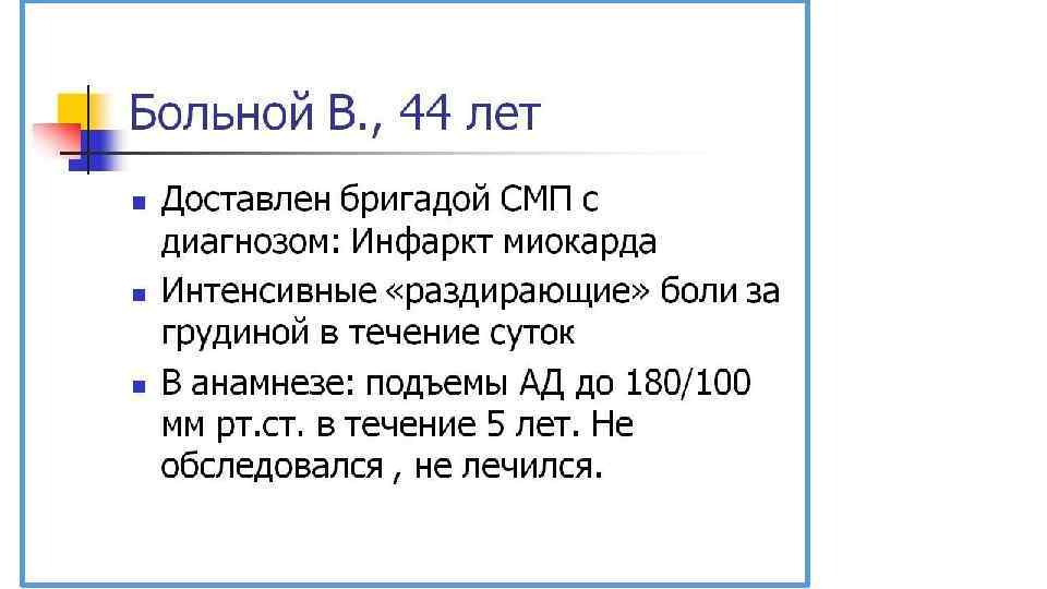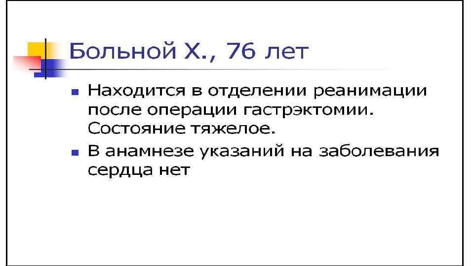 Интенсивная терап. Клинические ситуации (синдромы) • Острая серд. недостаточность (шок, отек легких) • Внезапная одышка в покое • Тяжелые неврол. проявления (судороги, , коматоз. сост. ) 4. нарушение крообр. опасное для жизни • Инфаркт миокарда • Пароксизм/желудочковая тахиаритмия • Остр. брадиаритмия • Гипертонический криз • ТЭЛА • Расслаивающая аневризма • Синдр. Морганьи Э-Стокса