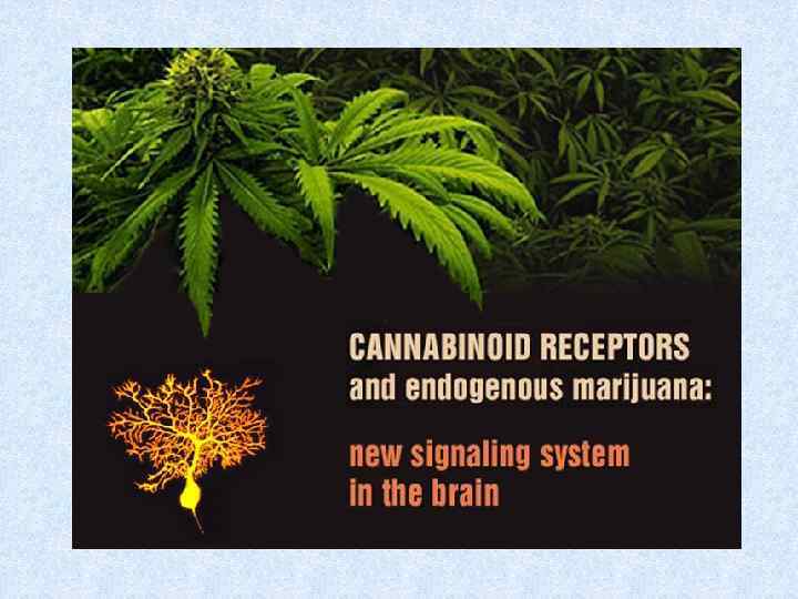 CANNABINOIDS: HYSTORY Cannabis sativa 1964: Psychoactive component of marijuana, Δ 9 - Tetrahydrocannabinol 1988: Cannabinoid receptor CB 1 1992: Endogenous cannabinoids: ● anandamide (arachidonoyl-ethanolamide, AEA) ● 2 -arachidonoyl glycerol (2 -АG) 2001: Mechanism of action